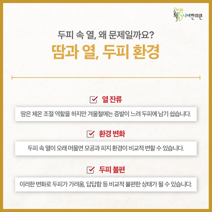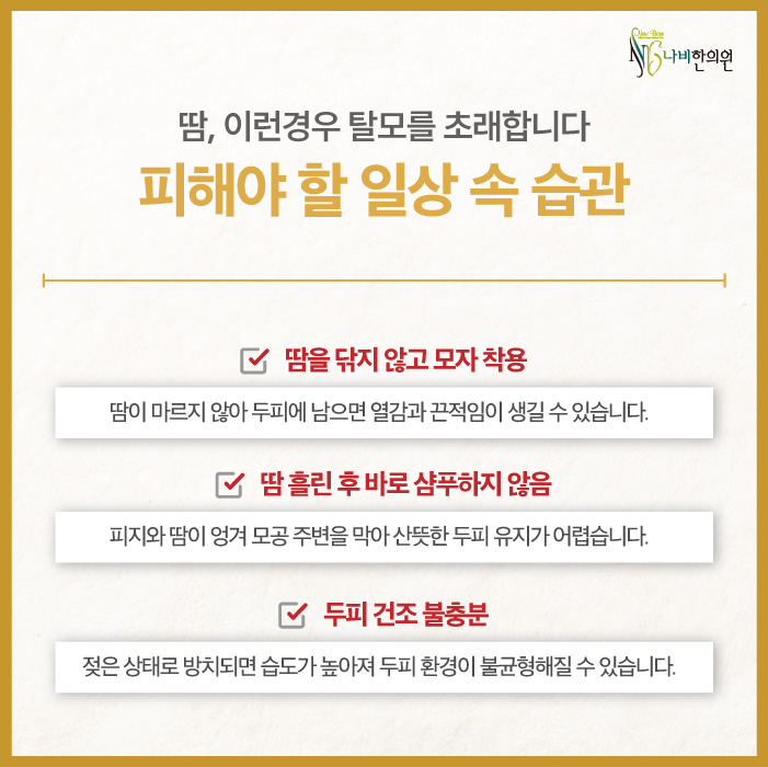 2) 땀이 마르면서 소금기와 노폐물이 두피에 남게 되며, 염증 반응을 유발할 수 있습니다.